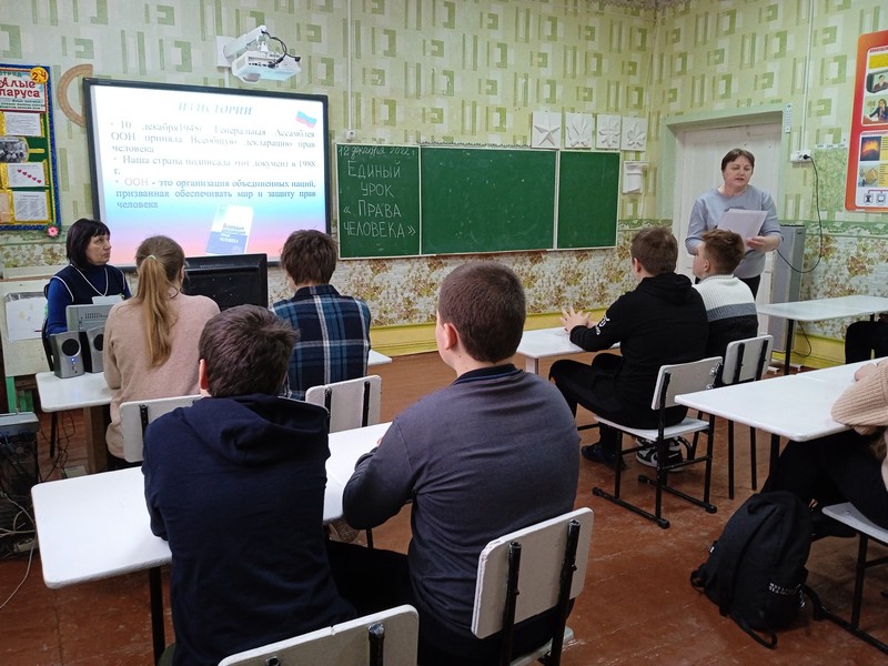 В рамках недели правовых знаний, проводимой с 10 по 17 декабря 2022 года, в школе проведен с обучающимися 8-11 классов Всероссийский единый урок «Права человека» учителем обществознания Высочевой Л.Е. совместно со школьным уполномоченным по правам ребенка Самсоновой Н.А.