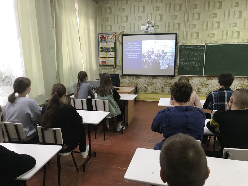 18 ноября 2022 г. в преддверии Дня начала Нюрнбергского процесса в школе проведены уроки истории этого величайшего и самого страшного в истории человечества судебного процесса, который длился почти целый год, с 20 ноября 1945 по 29 октября 1946 года. Это был НЮРНБЕРГСКИЙ ТРИБУНАЛ, первый в истории международный военный суд, впервые осудивший преступления против человечества.