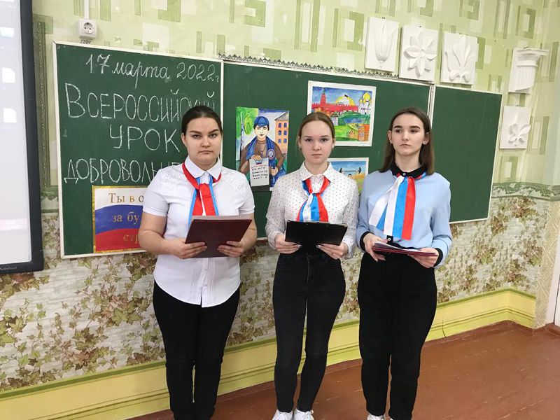 С целью создания условий для гражданско-патриотического и духовно-нравственного воспитания детей и подростков, формирования у подрастающего поколения активной гражданской позиции путем вовлечения в добровольческую и благотворительную деятельность 17 марта 2022 г. с обучающимися 8-10 классов проведен Всероссийский урок Добровольчества классным руководителем 10 класса Рягузовой О.Н.