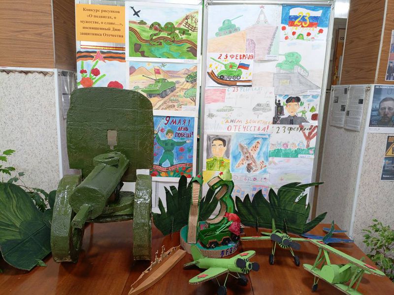 "О подвигах, о мужестве, о славе" под таким названием проведен конкурс рисунков в Зазерской школе, посвящённый Дню защитника Отечества, организованный советником директора по воспитанию, учителем изобразительного искусства Самсоновой Н.А.. В фойе школы оформлена выставка рисунков и поделок.