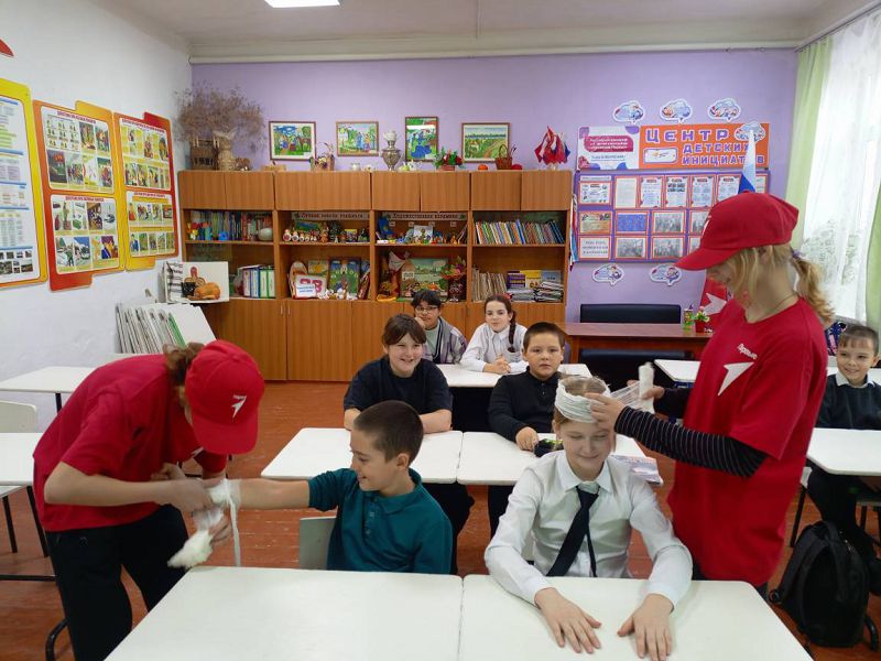 - "Добровольчество в сфере здравоохранения" в рамках этого направления активистами с учителем физической культуры Надеждой Борисовой была проведена зарядка с обучающимися всей школы, а учителем ОБЗР Ольгой Рягузовой и волонтерами-медиками 9 класса мастер-класс по оказанию первой помощи с детьми 4-5 классов;